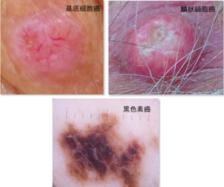 常見的皮膚癌有基底细胞癌,麟狀細胞癌,和黑色素癌。基底细胞癌(Basal cell carcinoma) 屬最常見的皮膚癌,常生於曝曬部位如頭臉,手背或上半身。長期日曬的人需注意皮膚是否有不正常的腫塊,潰瘍,或逐漸變大的紅斑。好消息是它幾乎不會轉移,多數以手術切除即可根治。但如太晚就醫,腫瘤長的過大時,不但造成手術的困難,如果癌細胞侵蝕重要器官如眼耳口鼻等,則可能導致失明或破相。